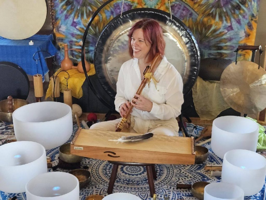 She brings a plethora of skills and instruments to the space, integrating sounds reflecting the natural elements, entrainment with voice and drumming.